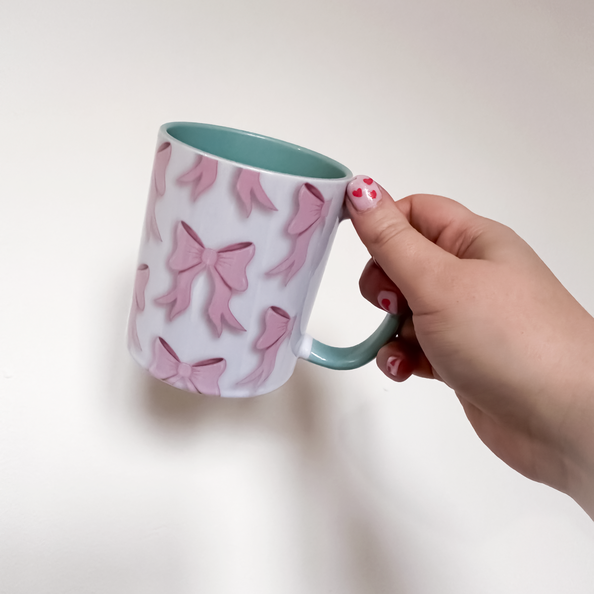 This Pink Bow Desk Ritual Bundle pairs your pink bow ceramic mug (with mint green interior and handle) with your choice of matching mug rug.