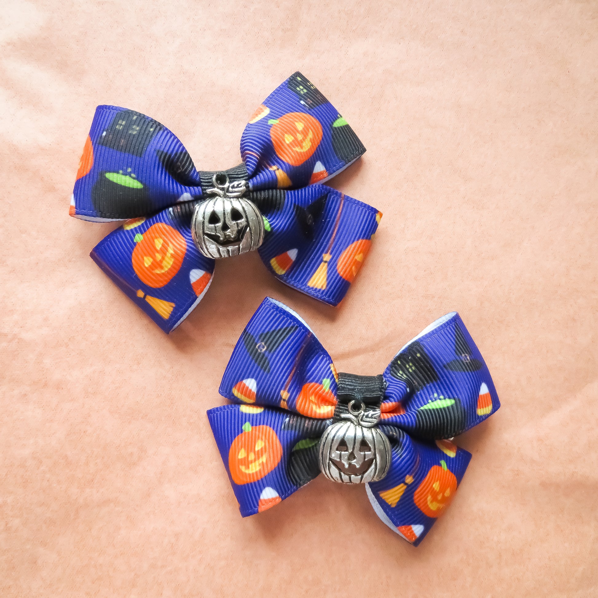 These cute pumpkin themed hair bows come as a pair with alligator clips with purple and black ribbon bows having been hand sewn and hand glued to ensure endurability.